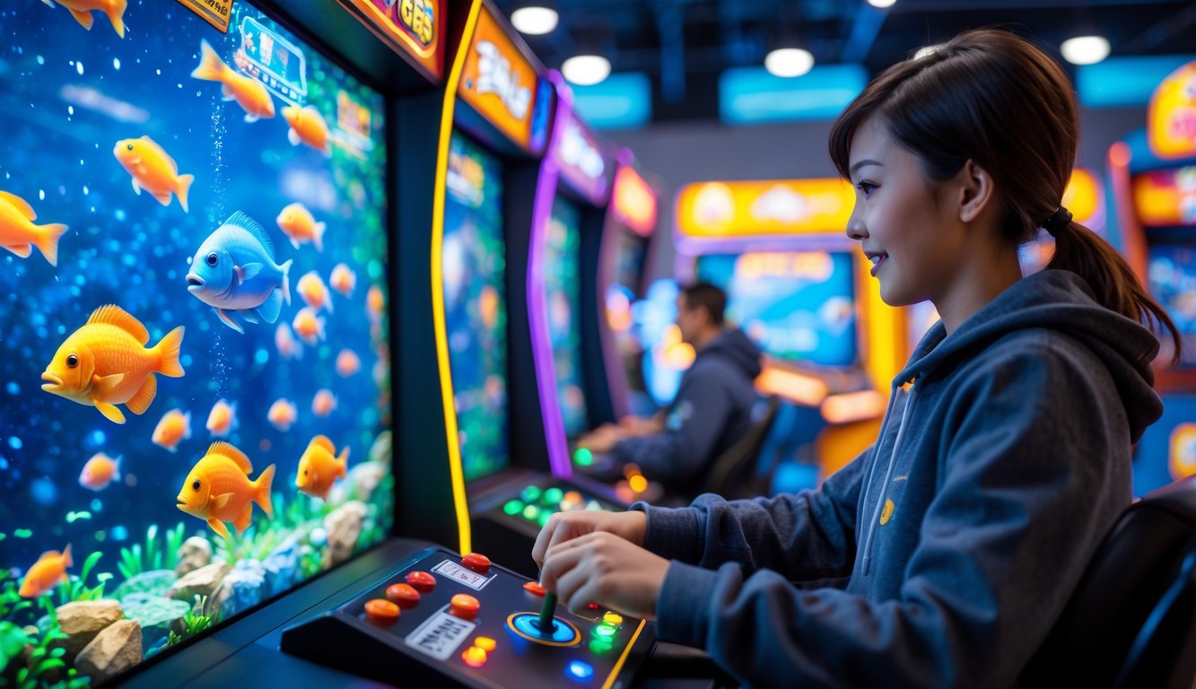 Seseorang sedang bermain permainan tembak ikan di arcade dengan layar digital penuh warna dan suasana ramai.